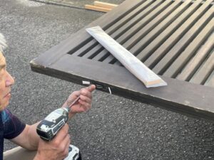 建具屋さんが戸車を外しパッキンにて高さを調整。 そして門扉を二人で戻して・・・